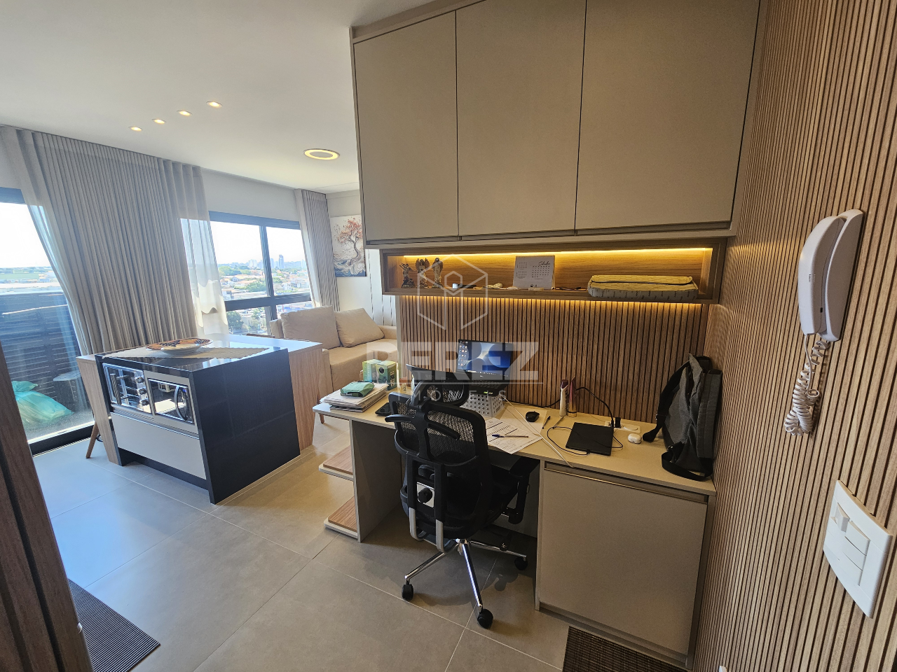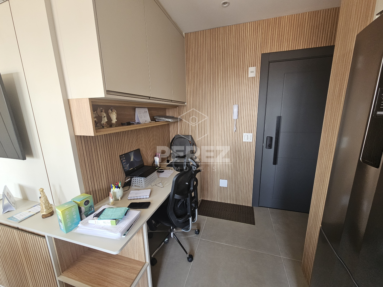 01 Escritório – Com armários planejados, proporcionando um espaço de trabalho funcional.