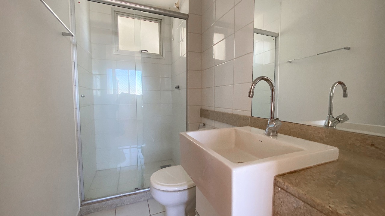 Banheiro social com armário embutido (A/E) e box em vidro;