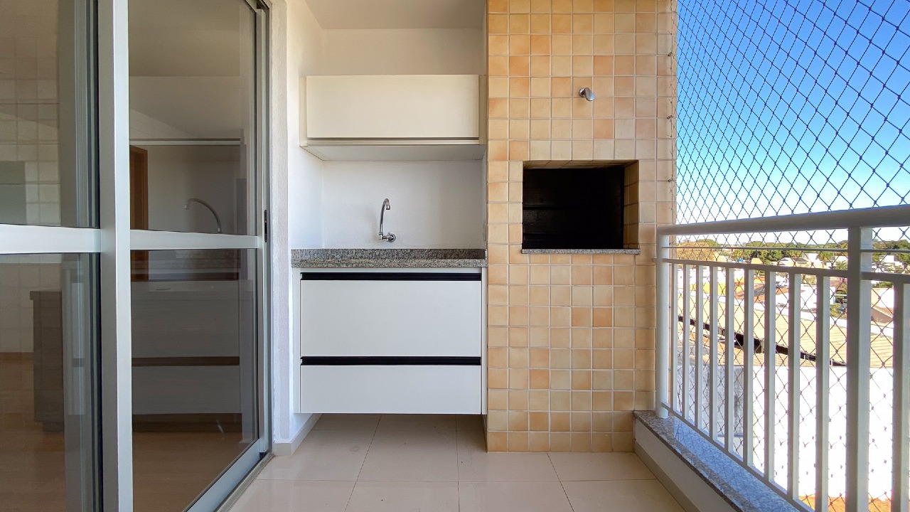 Sacada gourmet com churrasqueira, pia e armários embutidos (A/E), perfeita para receber amigos e aproveitar bons momentos;