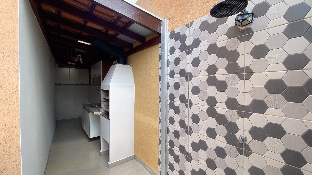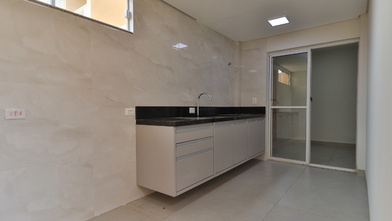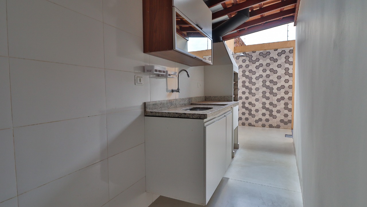 Varanda gourmet completa, equipada com churrasqueira pré-moldada, pia e armários embutidos (A/E), perfeita para momentos de lazer em família e com amigos;