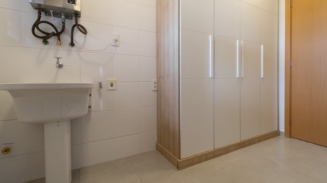 Área de serviço funcional, com armários embutidos (A/E) e banheiro de apoio;