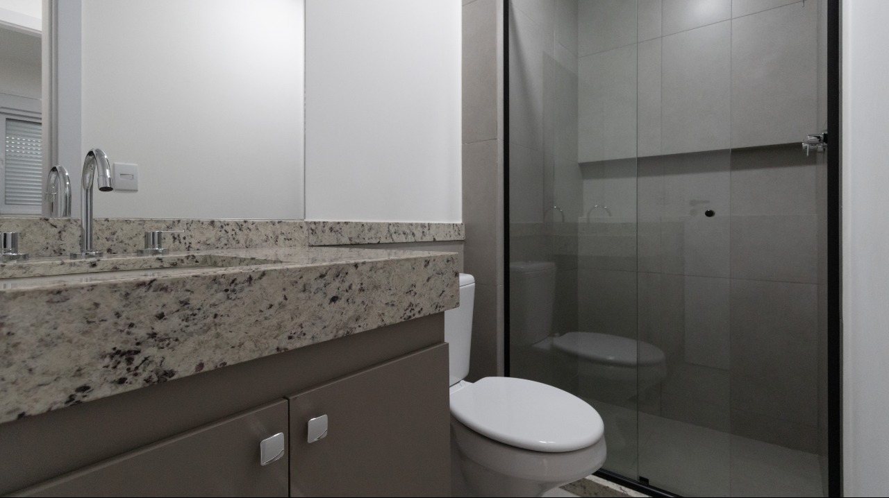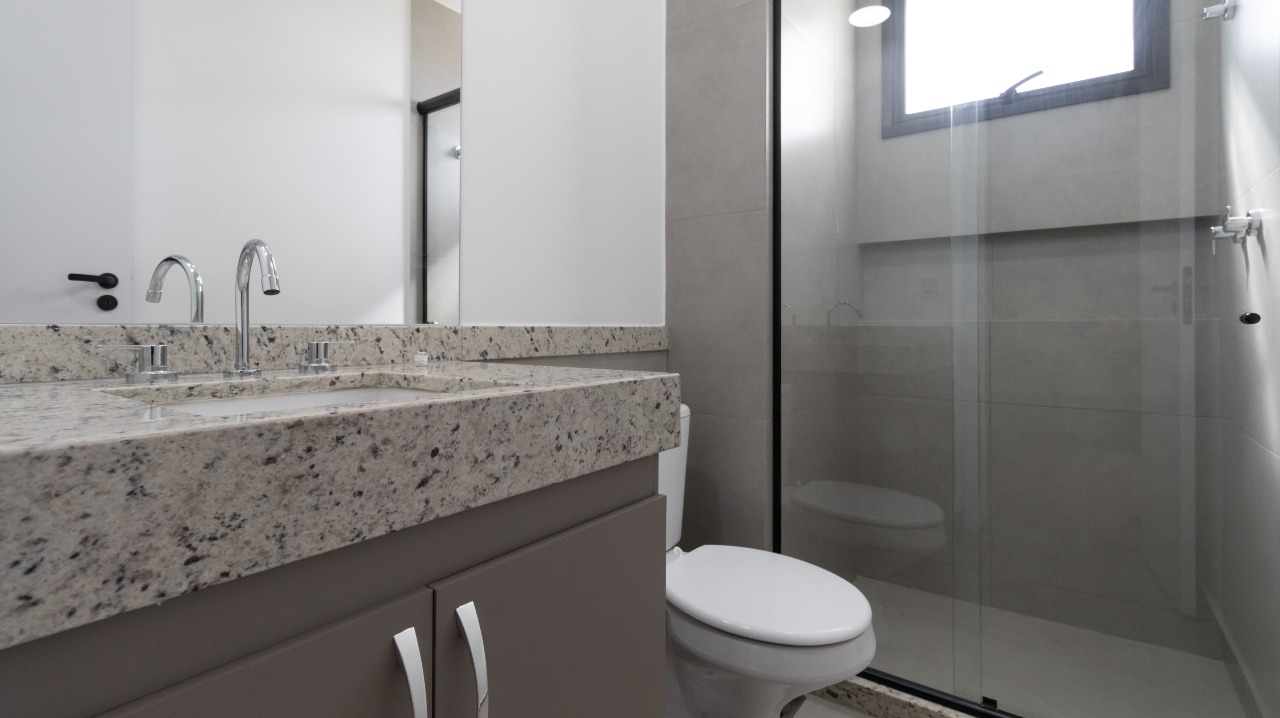 Banheiro social moderno, com armários embutidos (A/E) e box em vidro;