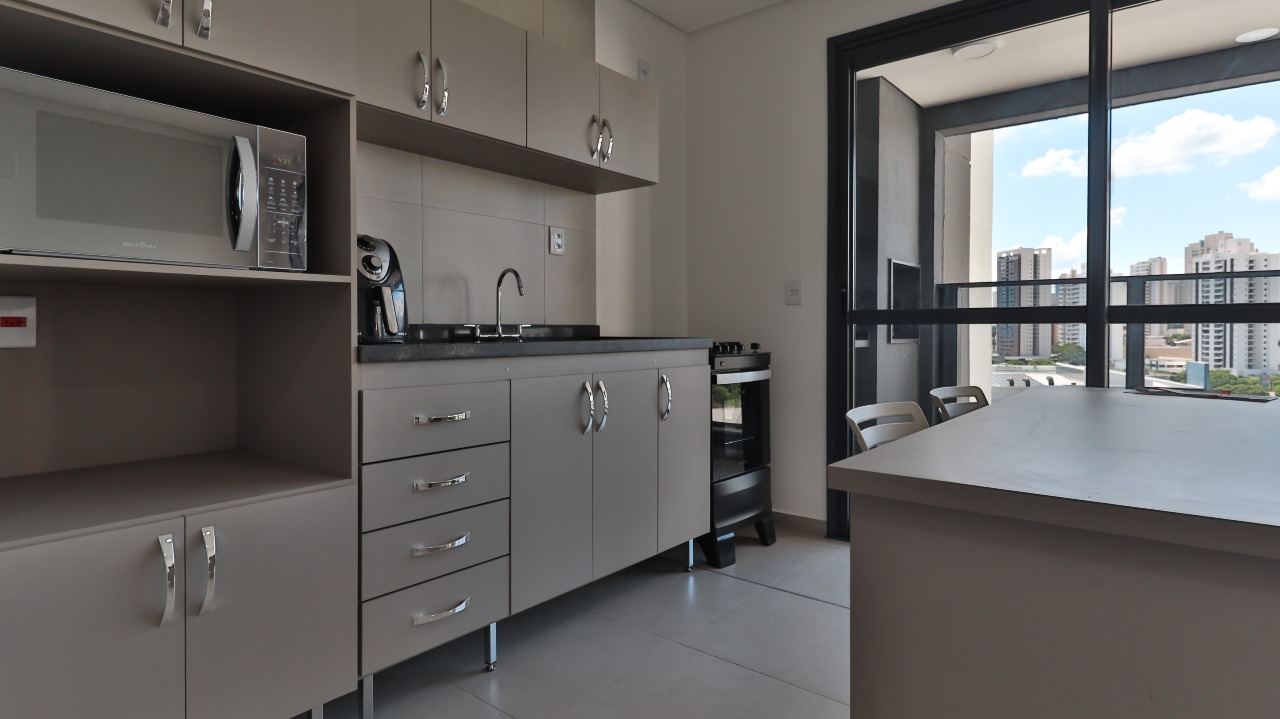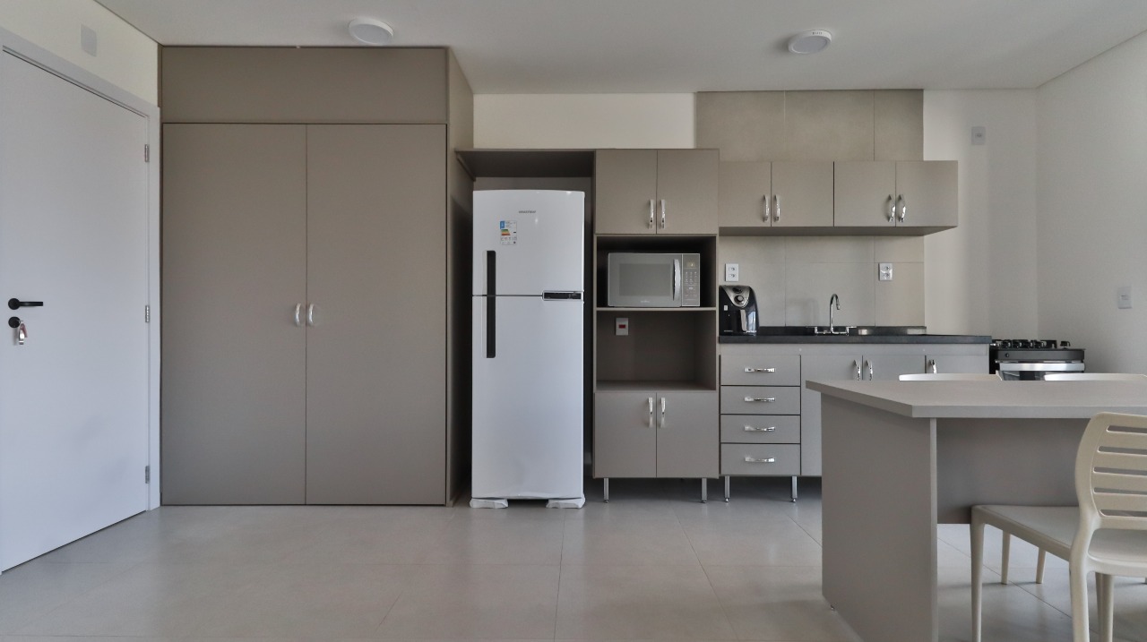 Cozinha planejada, equipada com armários embutidos (A/E), fogão, micro-ondas e geladeira, oferecendo praticidade no dia a dia;