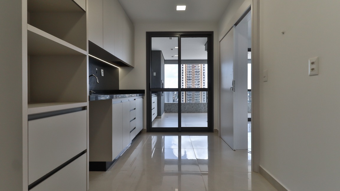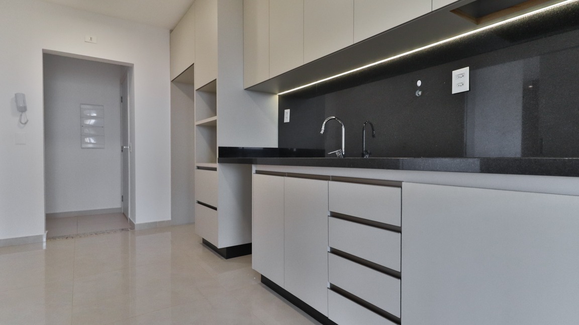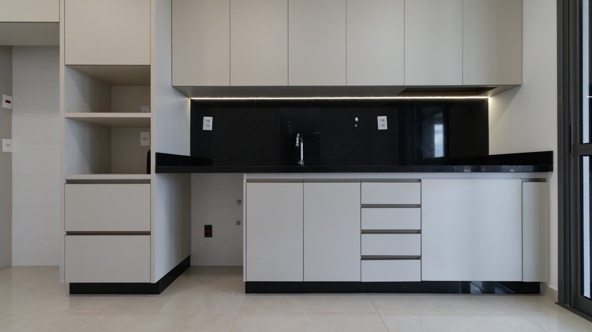 Cozinha moderna, equipada com armários embutidos (A/E), prática e funcional;