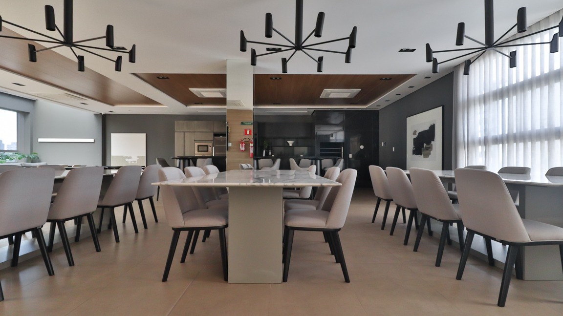 Sala de jantar integrada, com acesso direto à varanda gourmet, favorecendo a convivência;