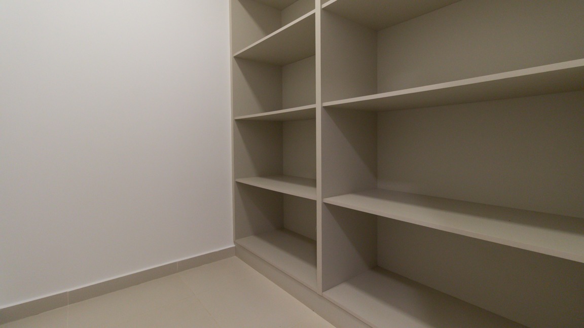 Área de serviço prática, com armários embutidos (A/E), depósito com prateleiras e WC de apoio, oferecendo organização e comodidade;