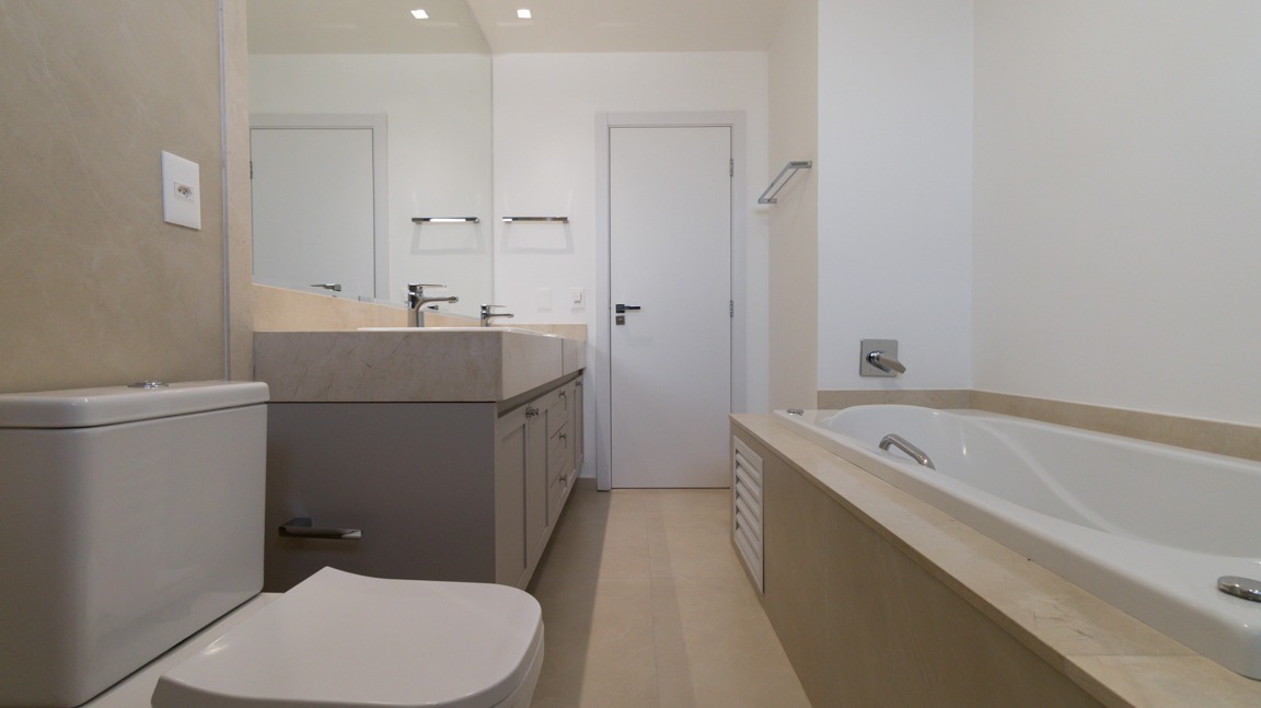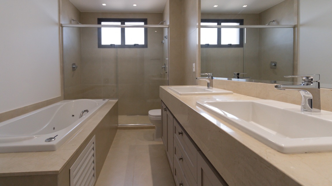 03 suítes espaçosas, todas equipadas com armários embutidos (A/E), sendo 1 suíte máster com banheira, garantindo privacidade e relaxamento;