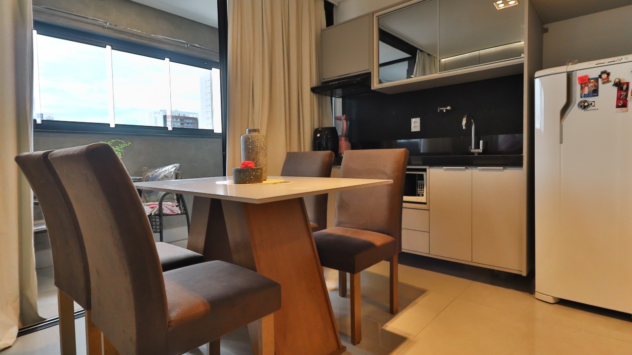 Cozinha com armários embutidos (A/E), garantindo praticidade, organização e melhor aproveitamento dos espaços;