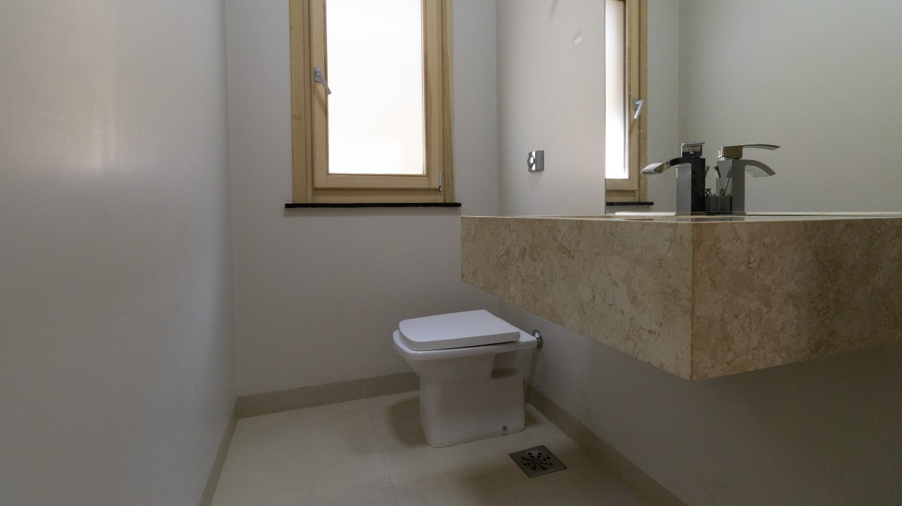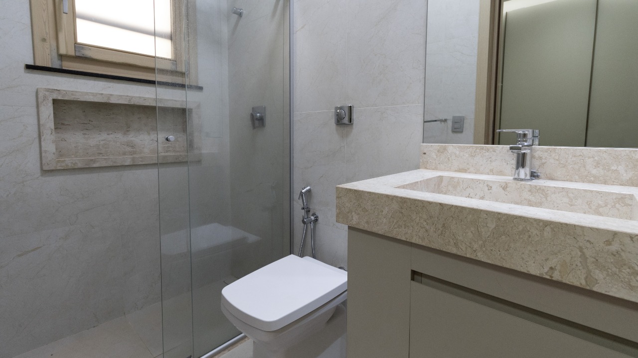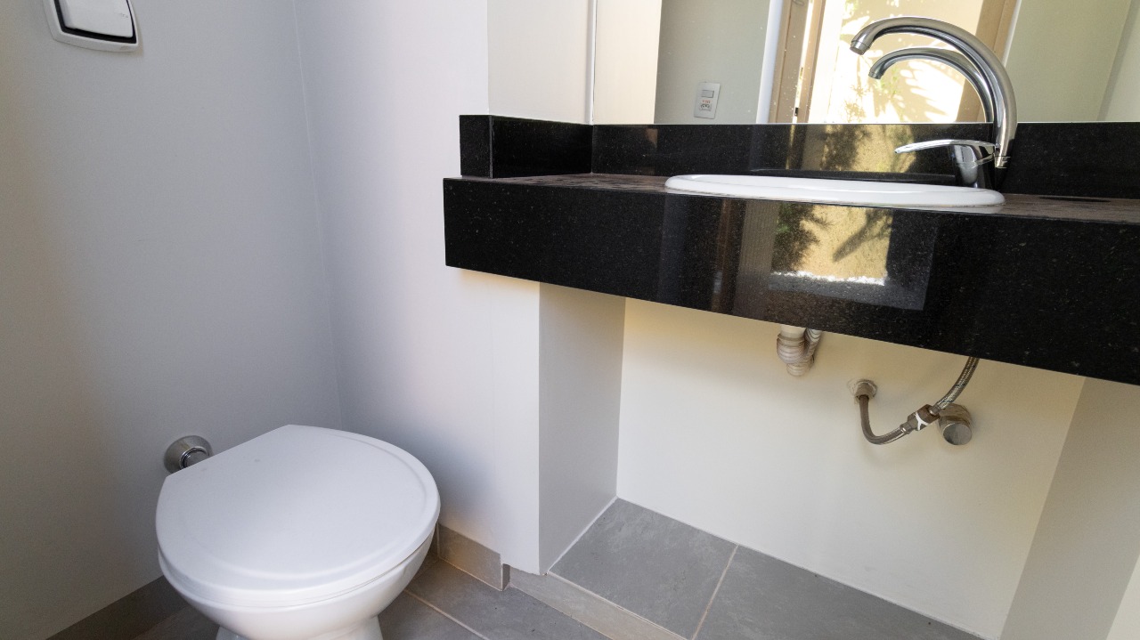Lavabo moderno, bem posicionado, trazendo comodidade para uso social;