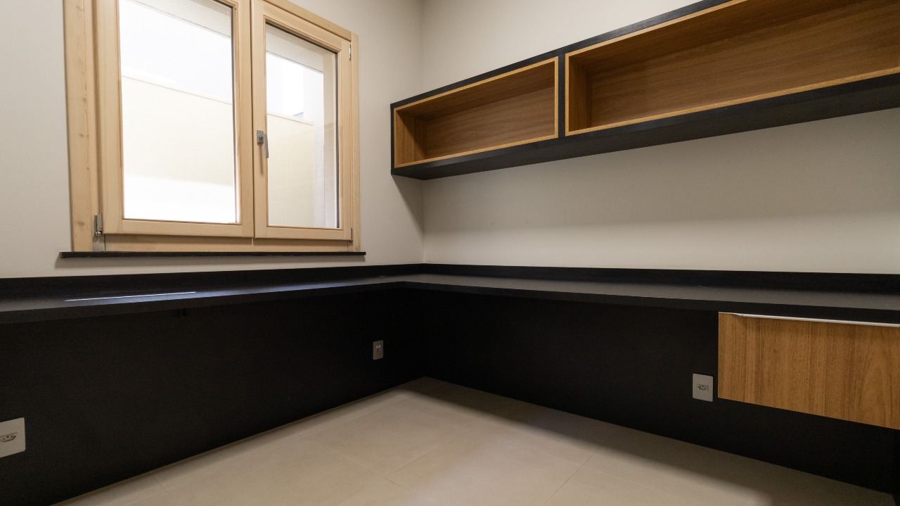 Escritório planejado com escrivaninha e nichos, perfeito para home office ou estudos;