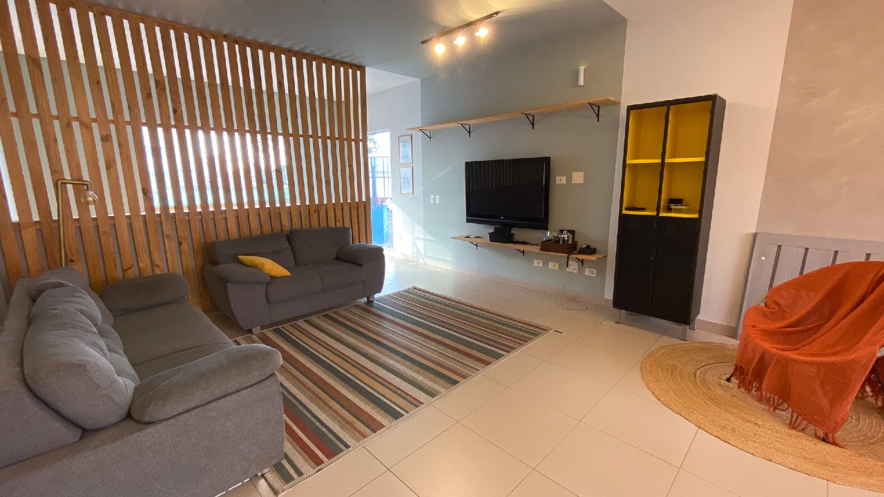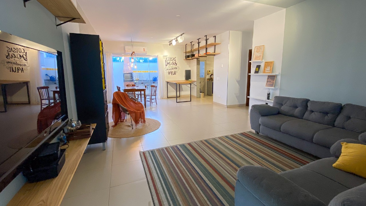 Sala de TV e sala de jantar integradas, oferecendo um espaço amplo e acolhedor para convivência;