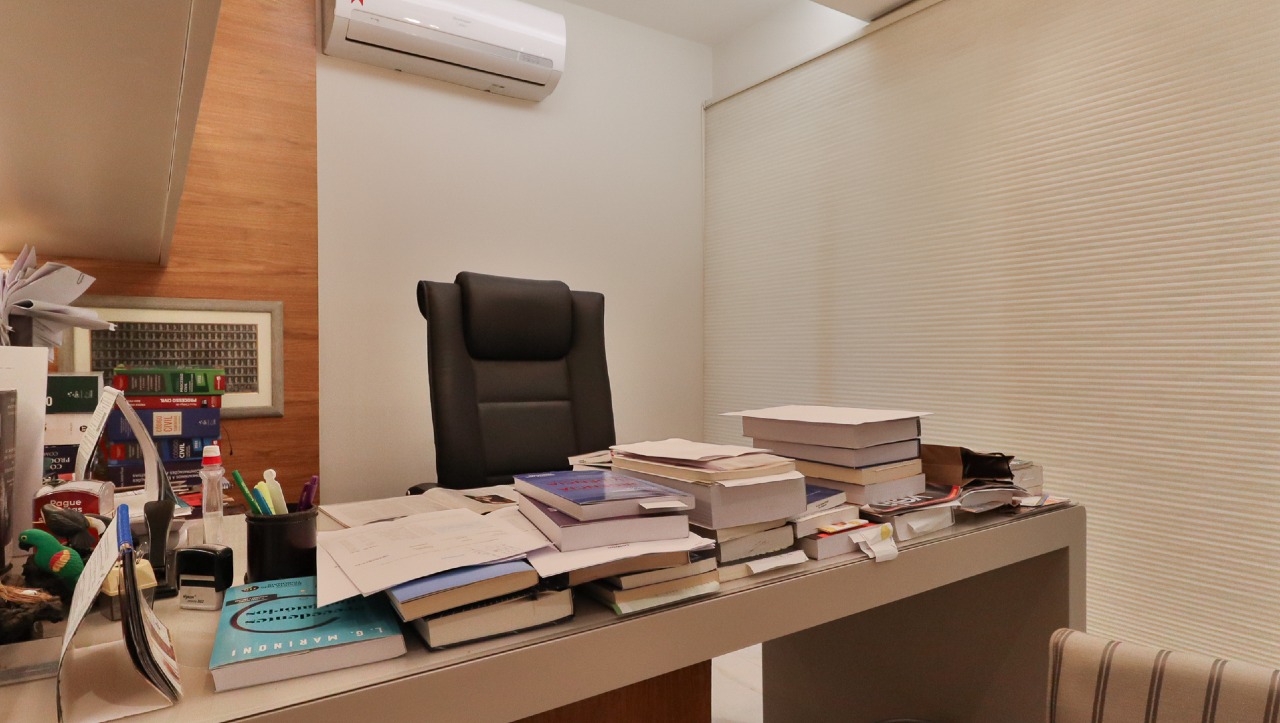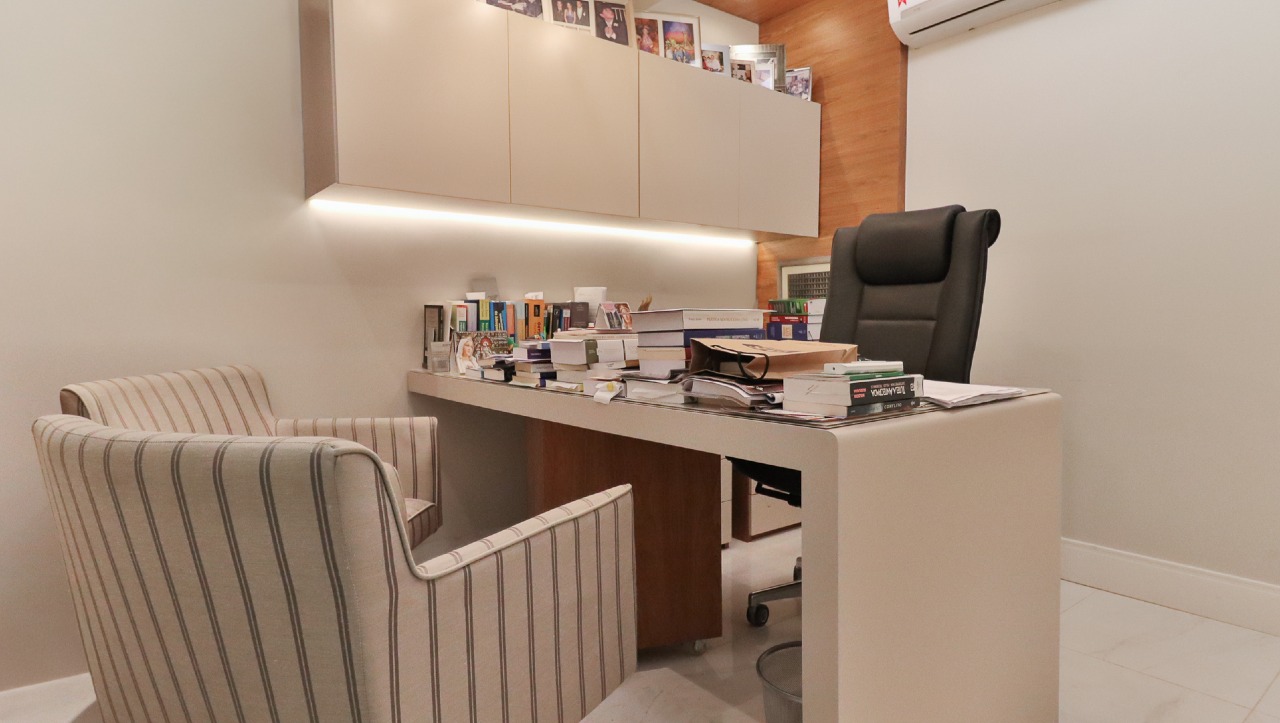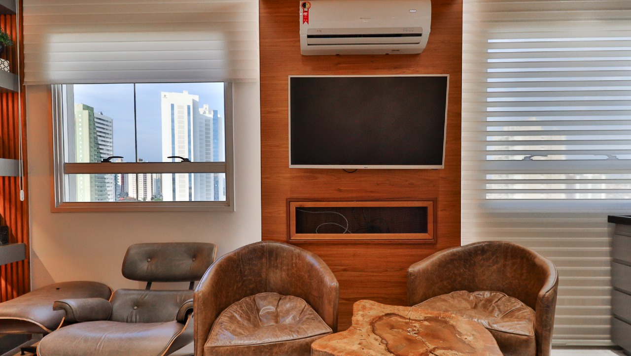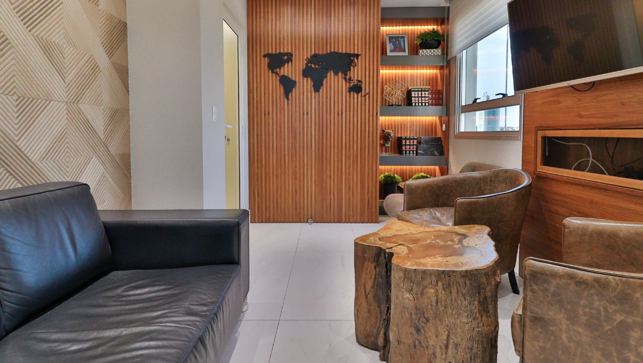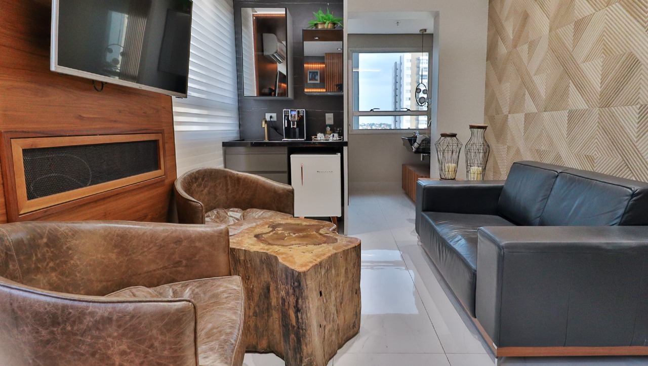 Sala versátil, equipada com sofá, TV e armários embutidos (A/E), ideal para reuniões, área de descanso ou atendimento personalizado;