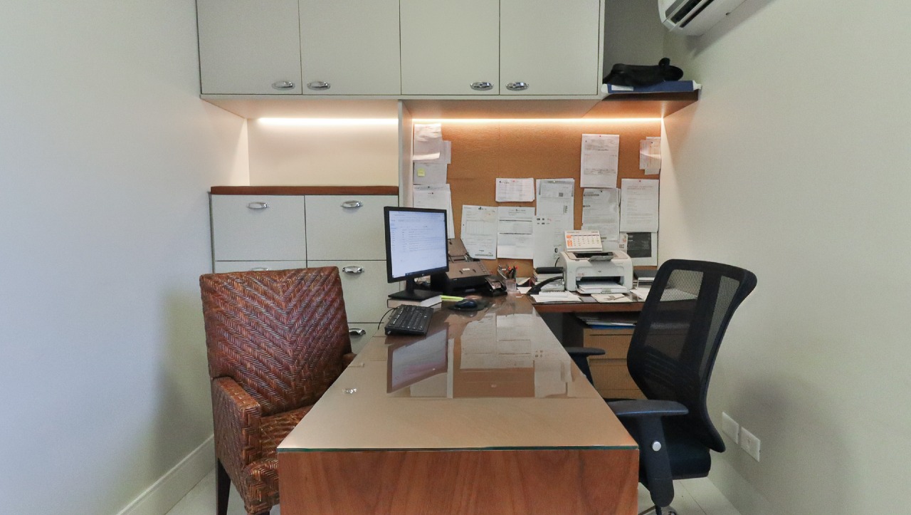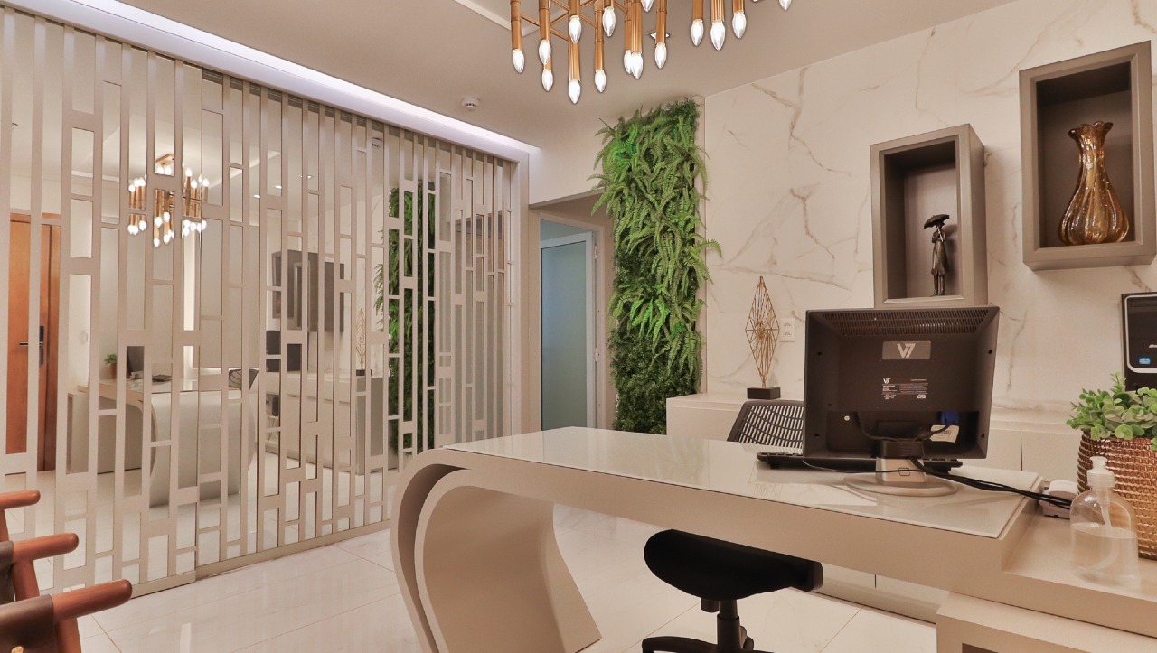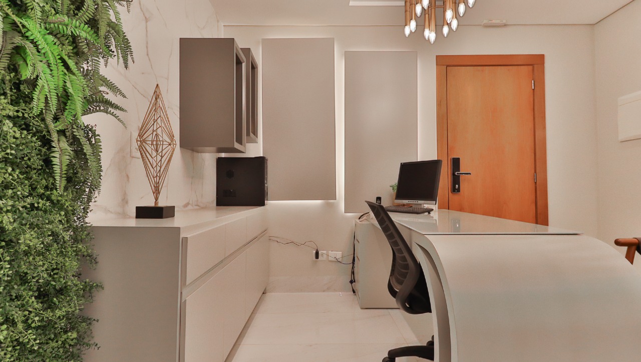 Recepção climatizada, equipada com armários embutidos (A/E), oferecendo um ambiente acolhedor e funcional para receber clientes e visitantes;