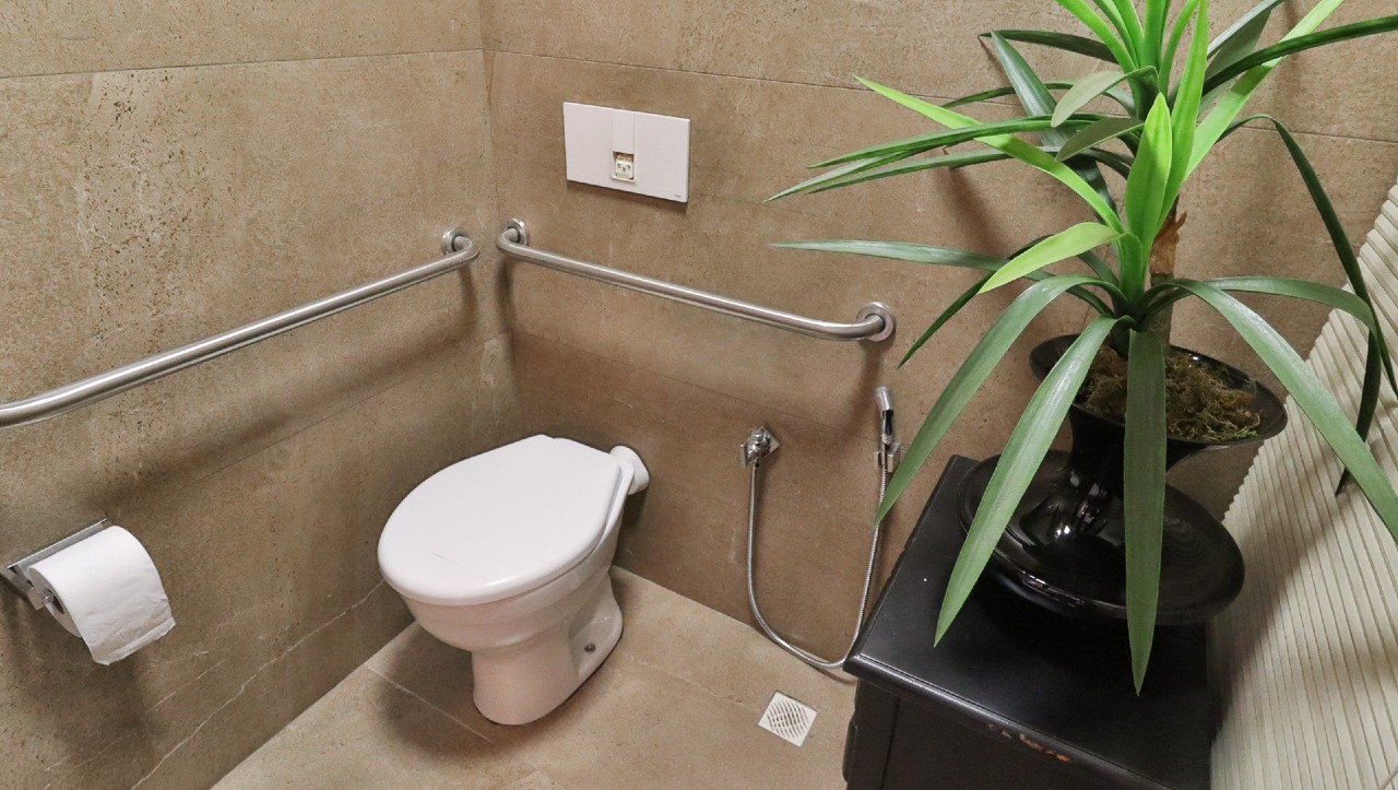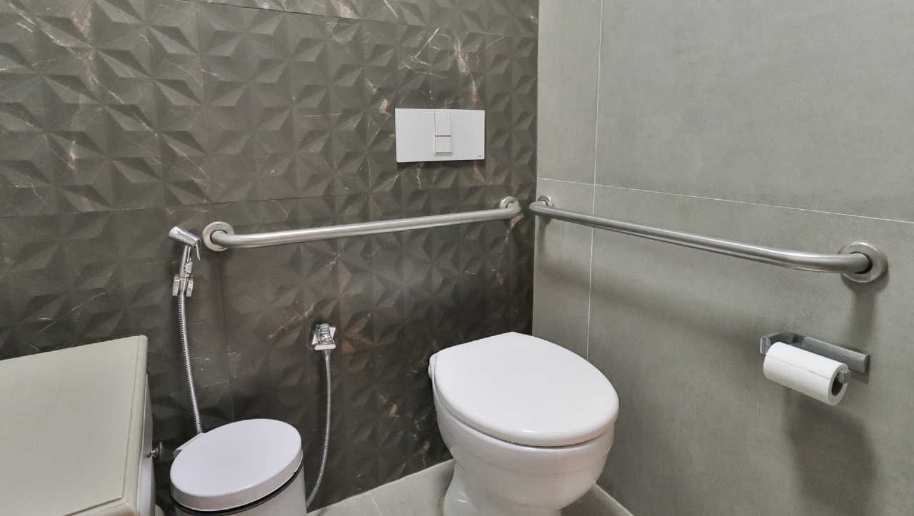 Banheiro adaptado para PcD, garantindo acessibilidade e conforto para todos;