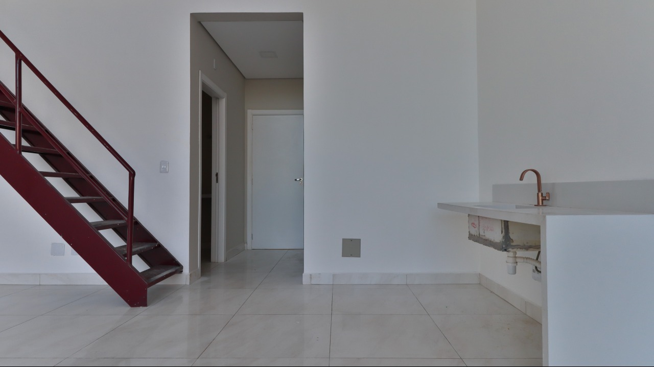 Escada em ferro que dá acesso ao mezanino, agregando versatilidade ao espaço.