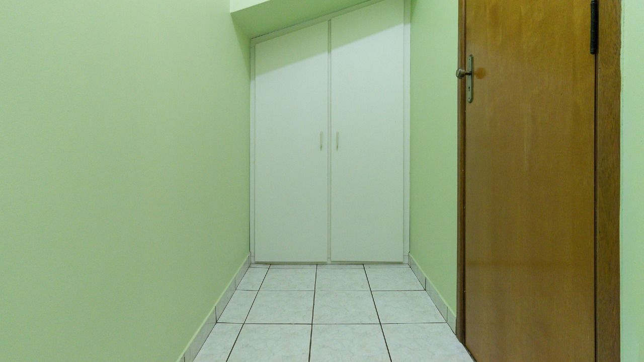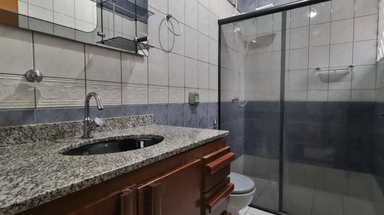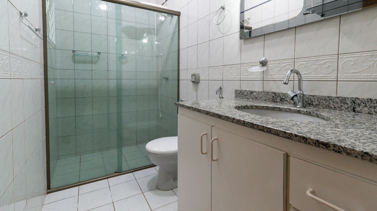 Banheiro social, com armário embutido (A/E) e box em vidro;