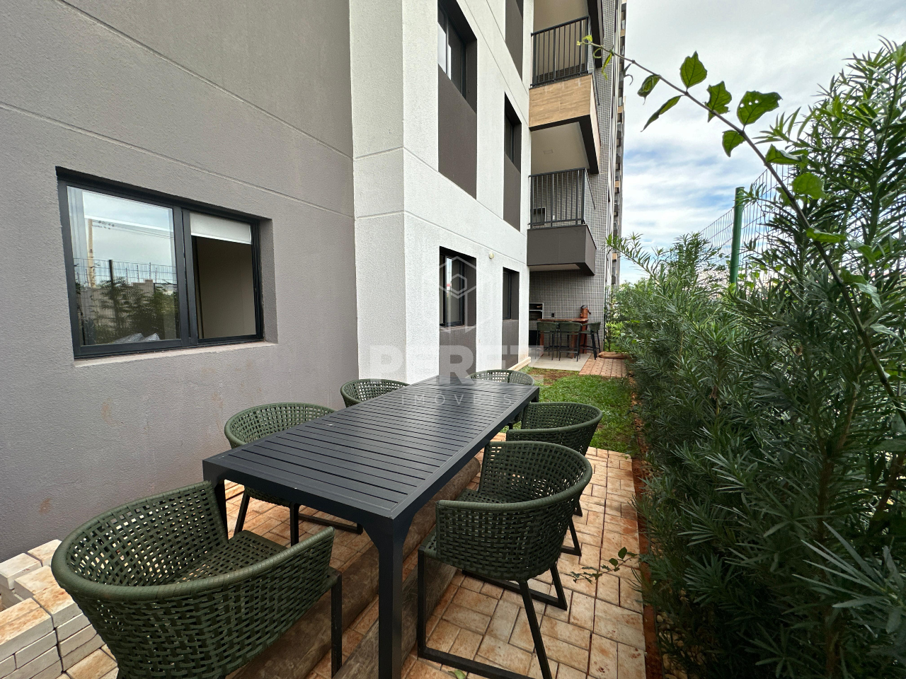 01 Jardim privativo – Isolado com cerca, contendo mesa para recepções e espaço gourmet com bancada em madeira trabalhada.