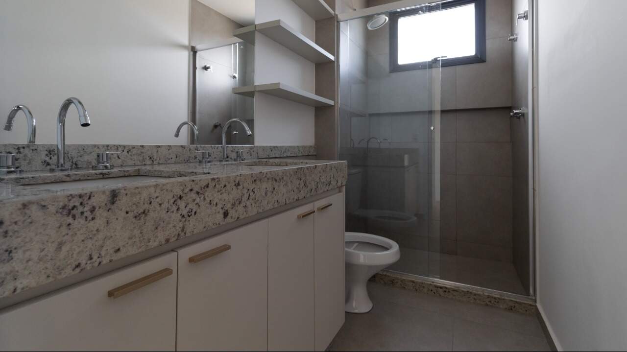 Banheiro social com armários embutidos (A/E), box em vidro e ducha, com bom acabamento e funcionalidade;