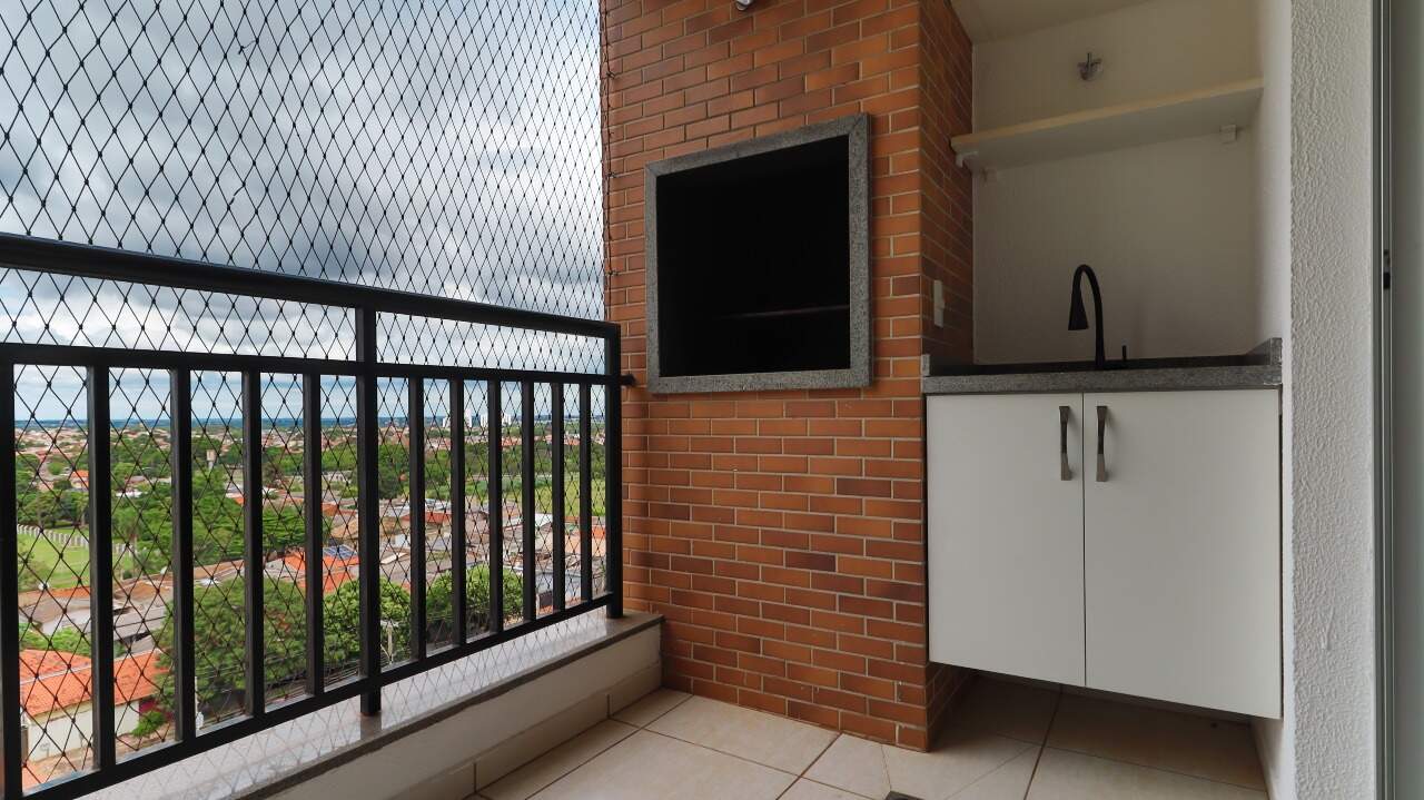 Sacada gourmet com churrasqueira e armários embutidos (A/E), ideal para momentos de lazer e convivência;