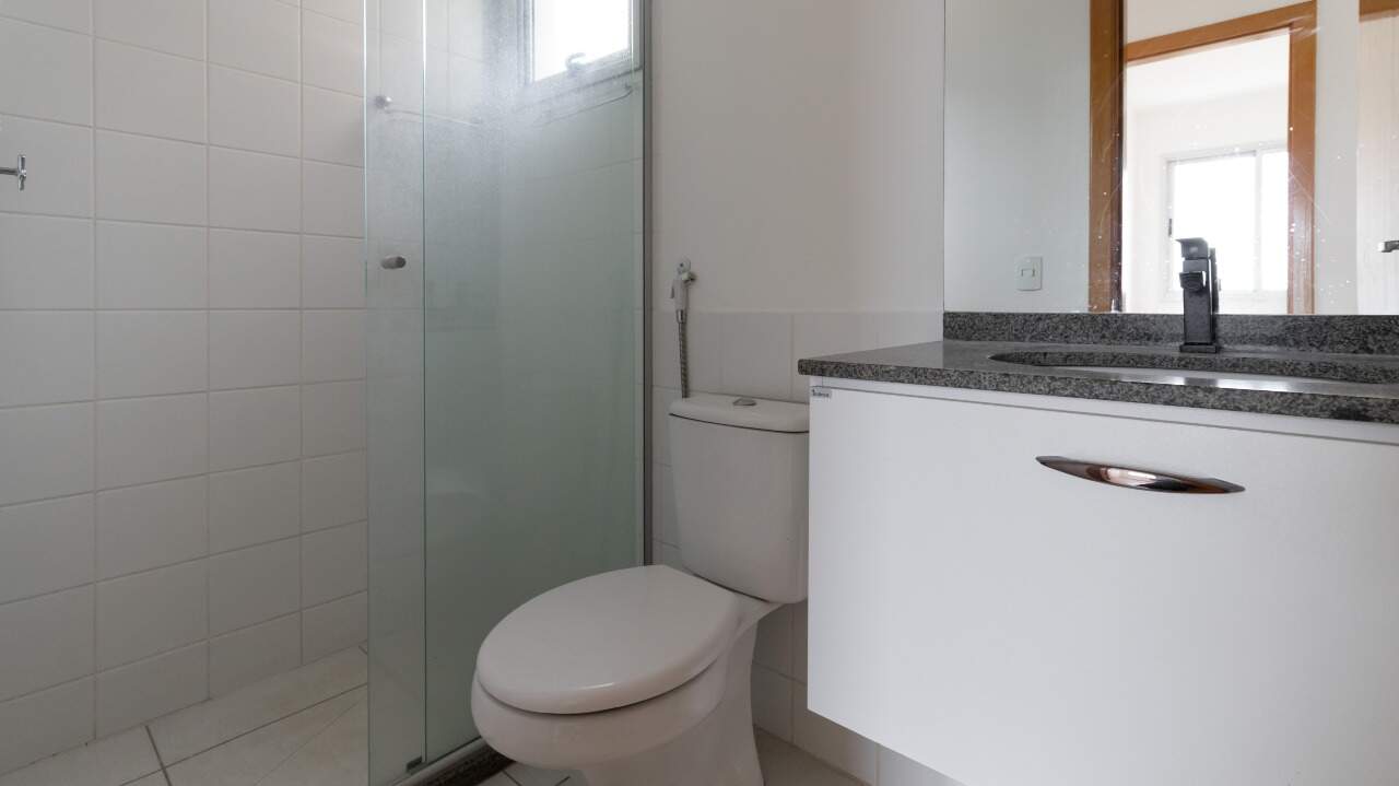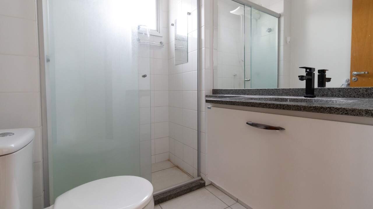 Banheiro social com armários embutidos (A/E) e box em vidro, com boa funcionalidade;