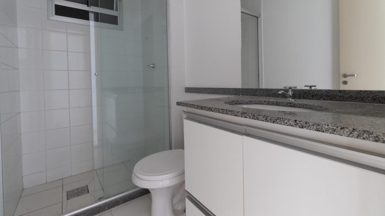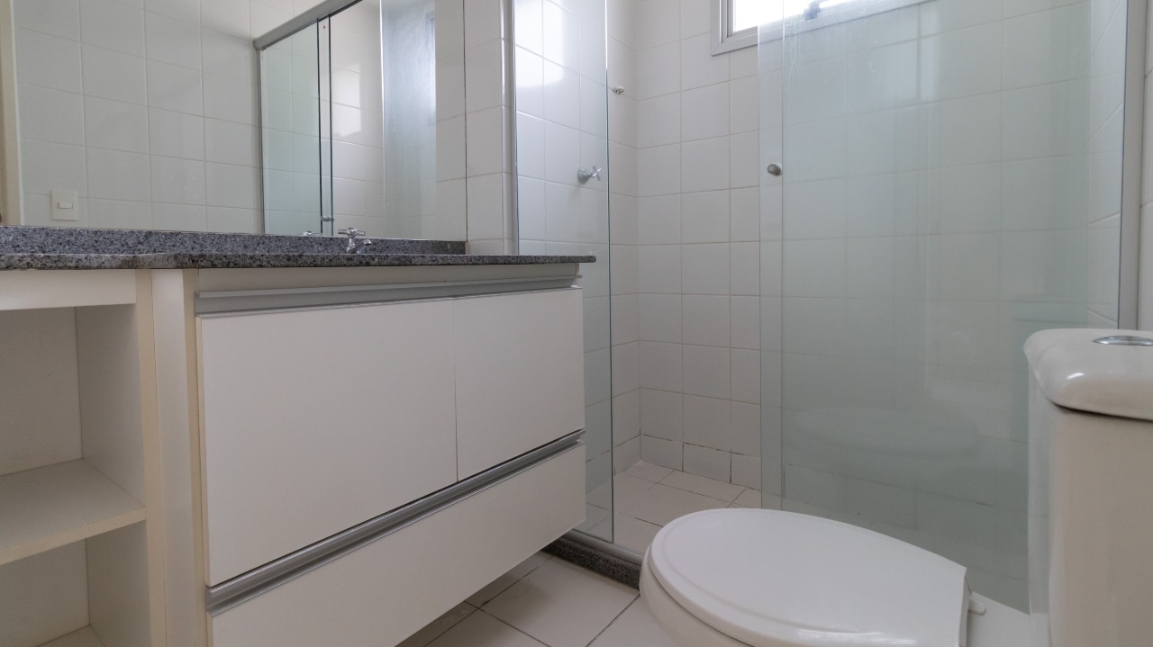 Banheiro social funcional, com armários embutidos (A/E) e box em vidro;