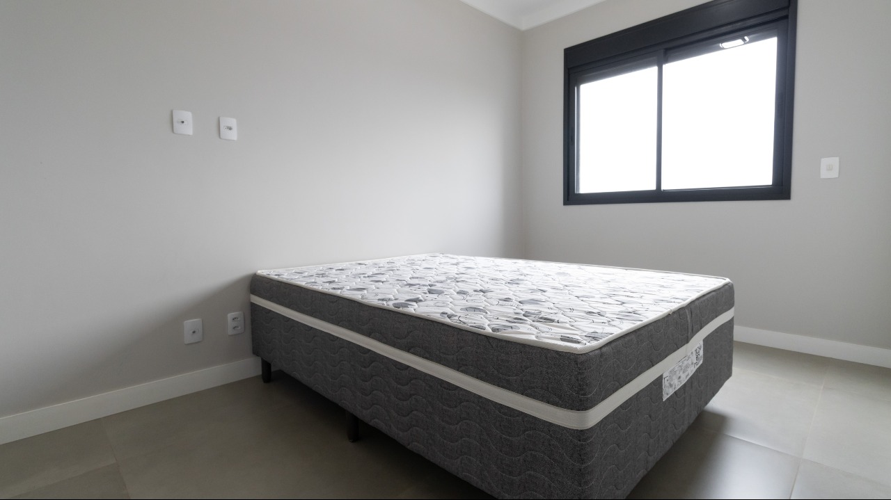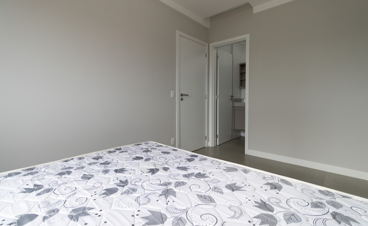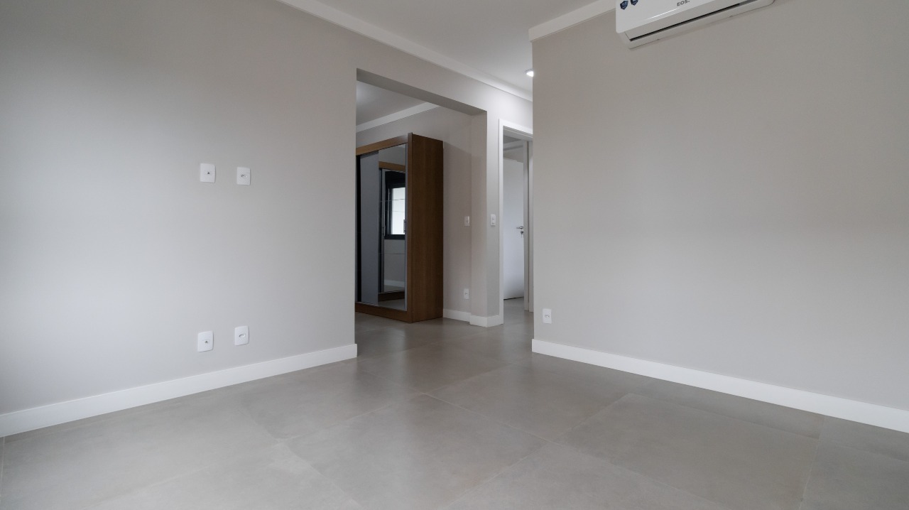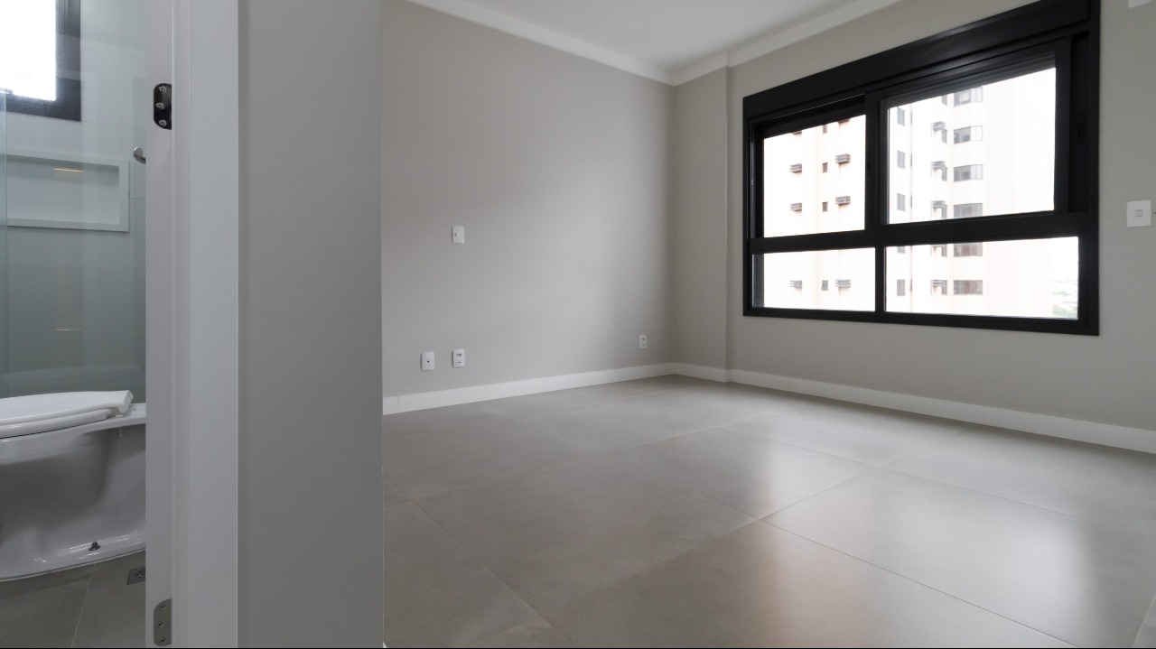 Suíte master ampla, bem iluminada e climatizada, com armários de apoio que agregam organização e conforto;