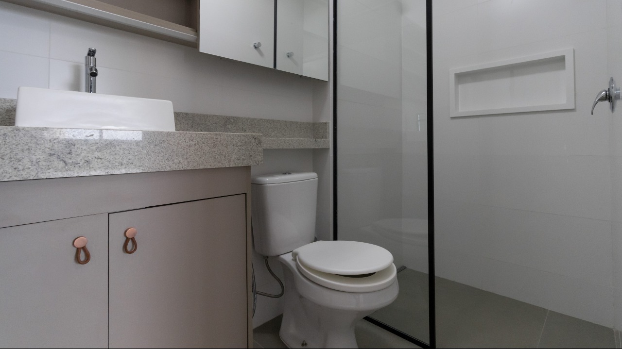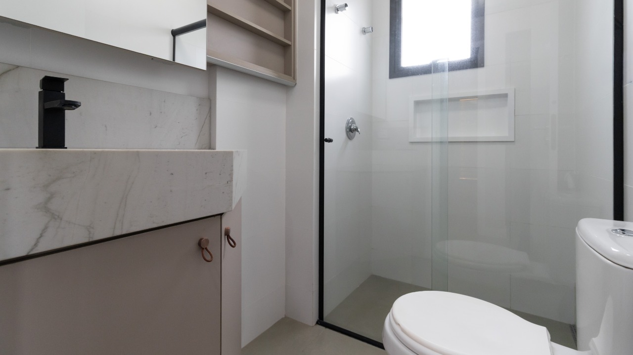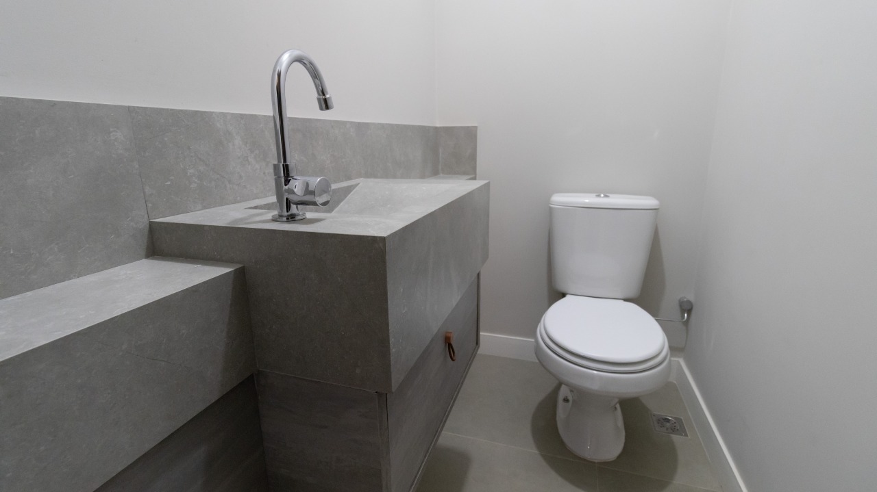 Lavabo moderno, bem posicionado e com acabamento elegante;