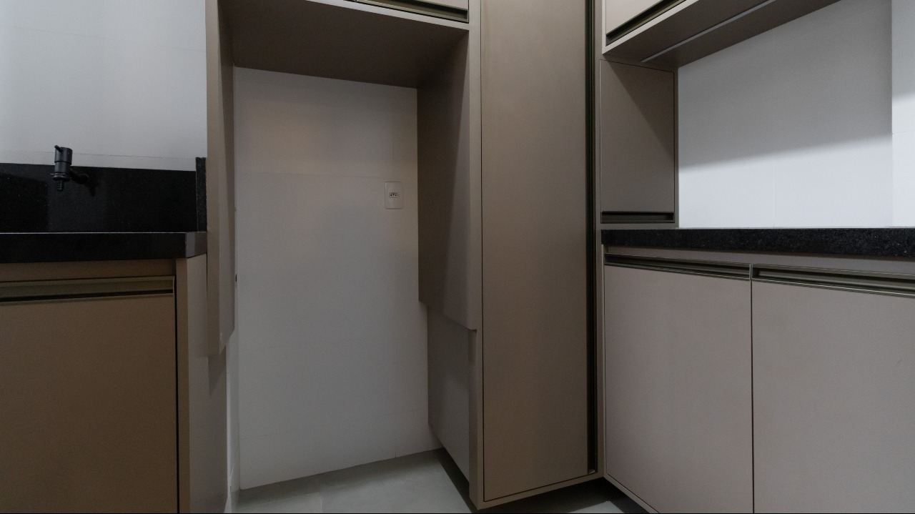 Área de serviço prática e funcional, com armários embutidos (A/E) que otimizam o espaço;