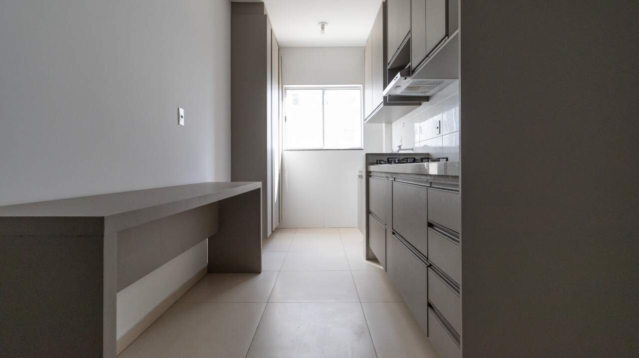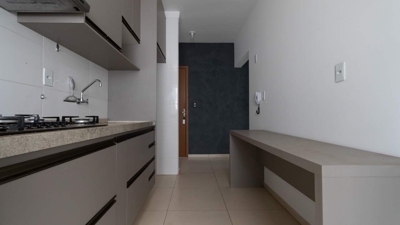 Cozinha funcional, equipada com armários embutidos (A/E), cooktop e depurador de ar;