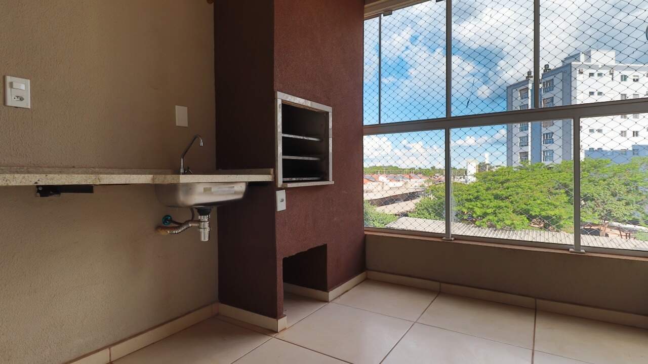 Sacada gourmet com churrasqueira e pia de apoio, ideal para momentos de lazer e recepção;