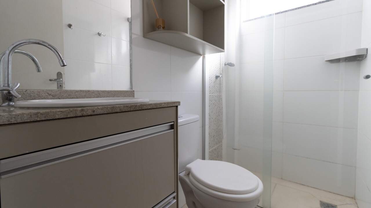 Banheiro social com armários embutidos (A/E) e box em vidro;