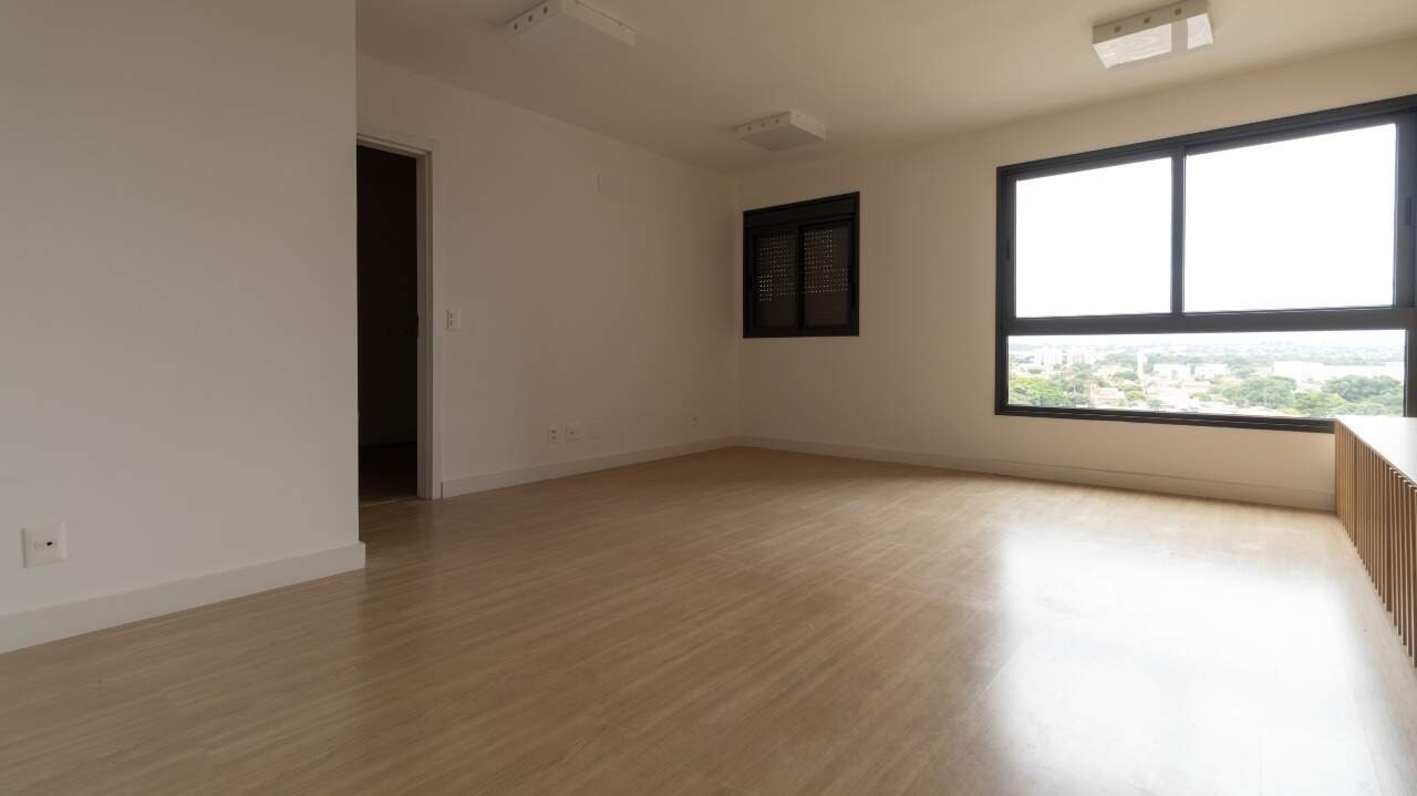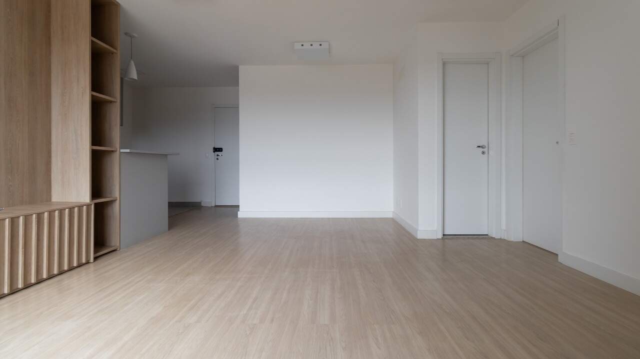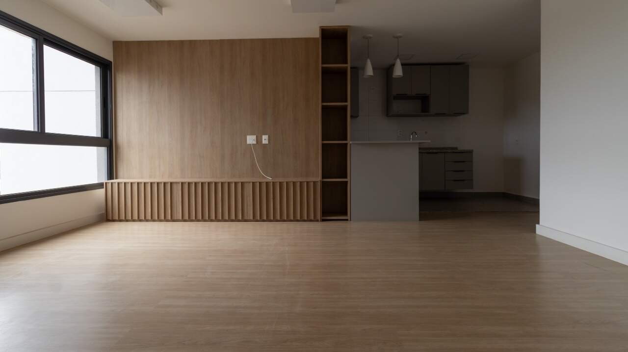 Sala de estar com excelente iluminação natural, equipada com painel e rack, proporcionando um ambiente confortável e bem aproveitado;