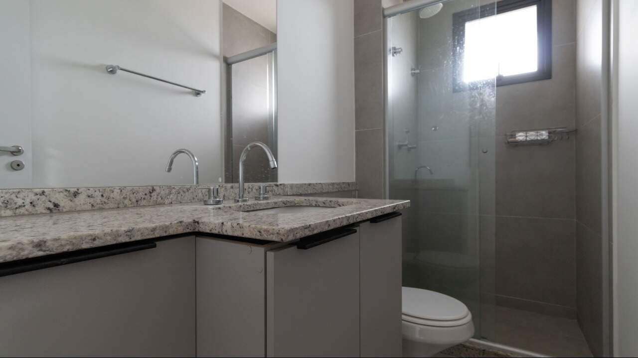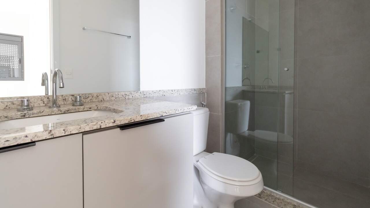 Banheiro social com armários embutidos (A/E) e box em vidro, com acabamento funcional;
