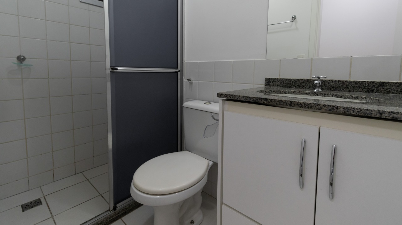 Banheiro social com armários embutidos (A/E) e box em acrílico;