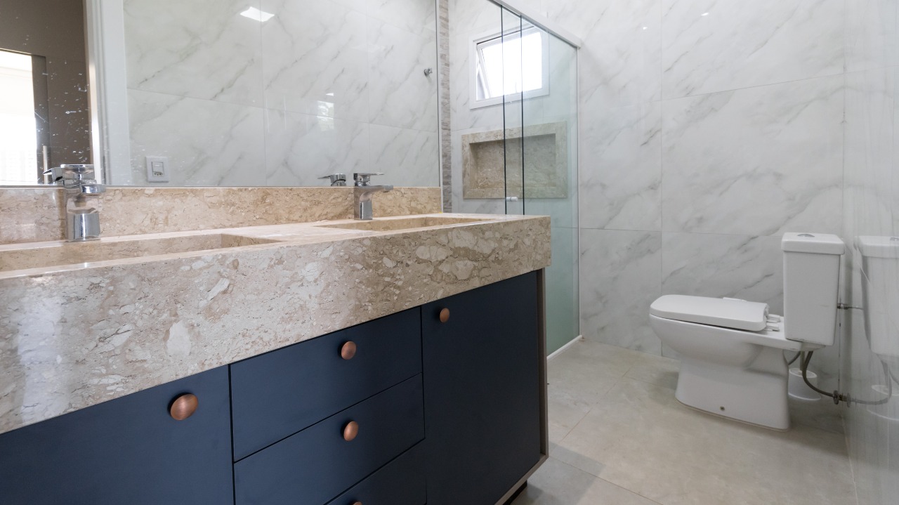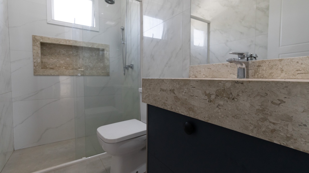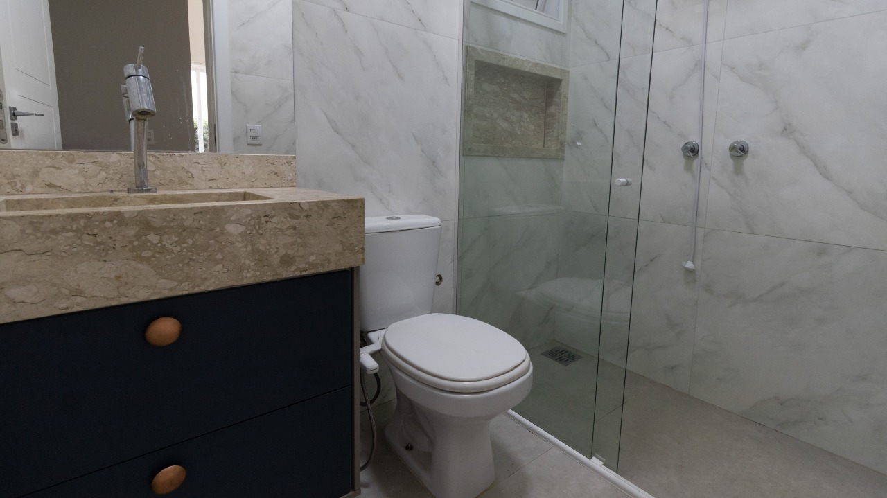 Banheiro social funcional, equipado com armário embutido (A/E) e box em vidro, oferecendo praticidade, organização e acabamento moderno.