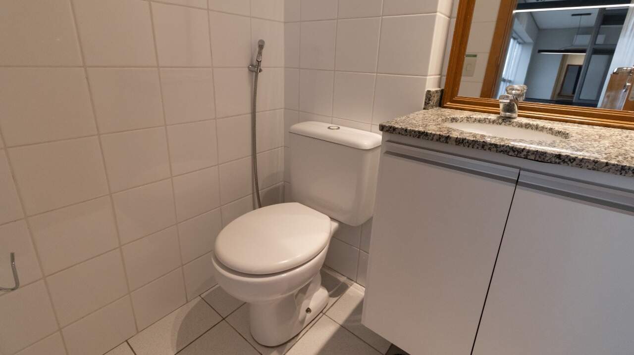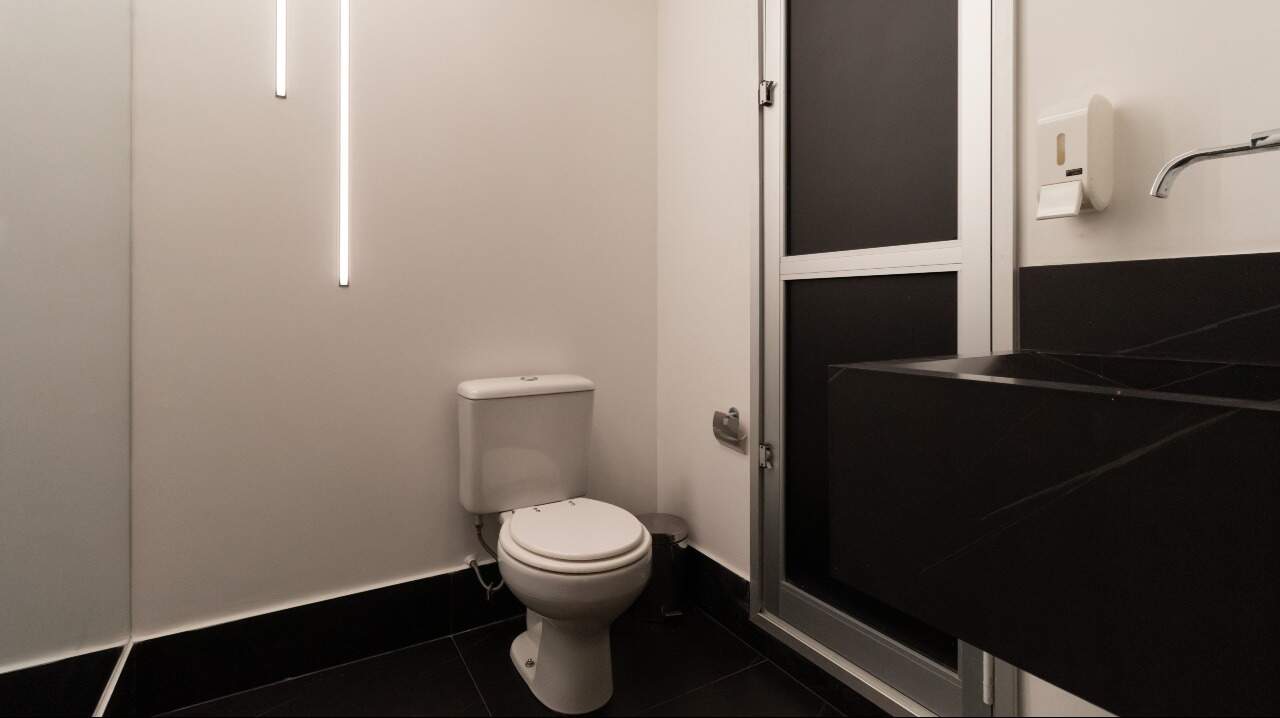 Banheiro social bem posicionado, atendendo com comodidade à equipe e aos visitantes.